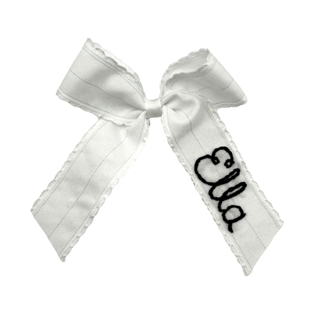 Head back to school in one of these unique, custom created back to school bows designed and available only from The Hat Lady website. Each bow is made with 1.5 inch fabric ribbon and measures approximately 4 inches across by 5 inches long. Those are hand embroidered in black thread in the name of your choice. When ordering please message us with the name you would like on your bow