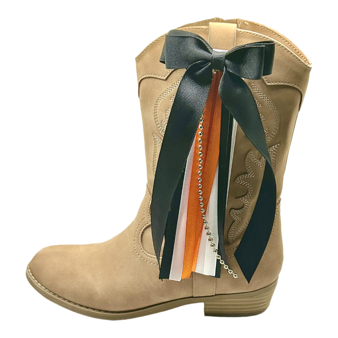 Elevate your game day look with adorable boot bows! Designed to add a touch of flair to your favorite pair of boots, these clip on boot bows are perfect for showcasing your school spirit or favorite colors with style. Made from high-quality materials, these bows for boots are durable and easy to attach, allowing you to effortlessly customize your footwear. Whether you're heading to a game, the rodeo, or just strolling around, these unique boot bows will surely make you stand out from the crowd and turn heads wherever you go!  Available in five sizes to fit even the smallest cowgirl.