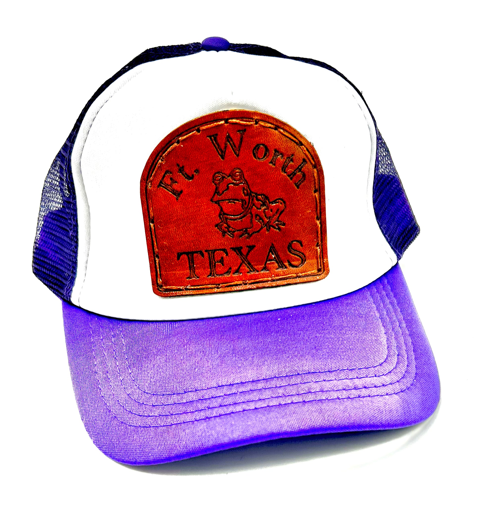 Hypnotoad Leather Patch Hat- Purple and White Ft. Worth Hypnotoad Trucker Hat