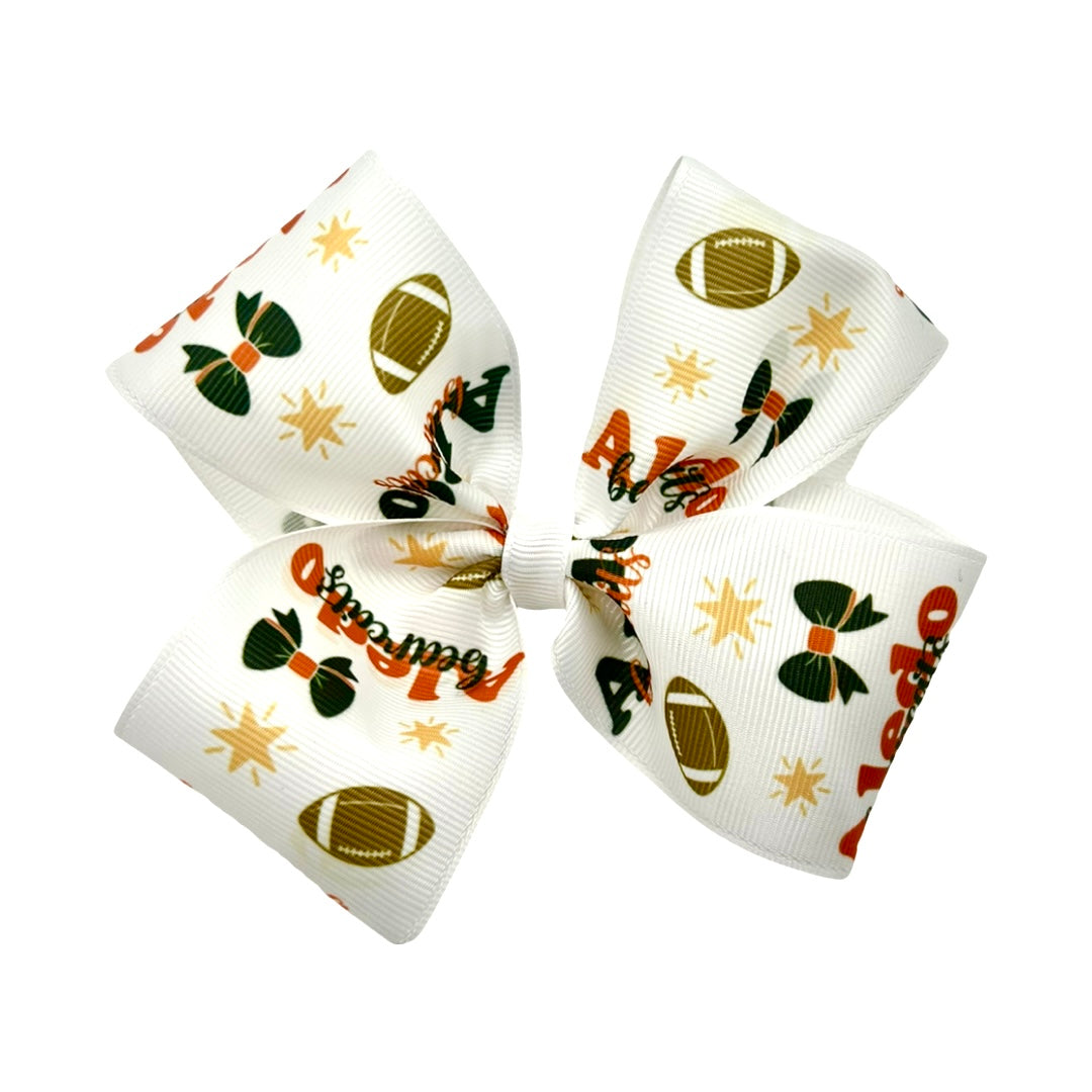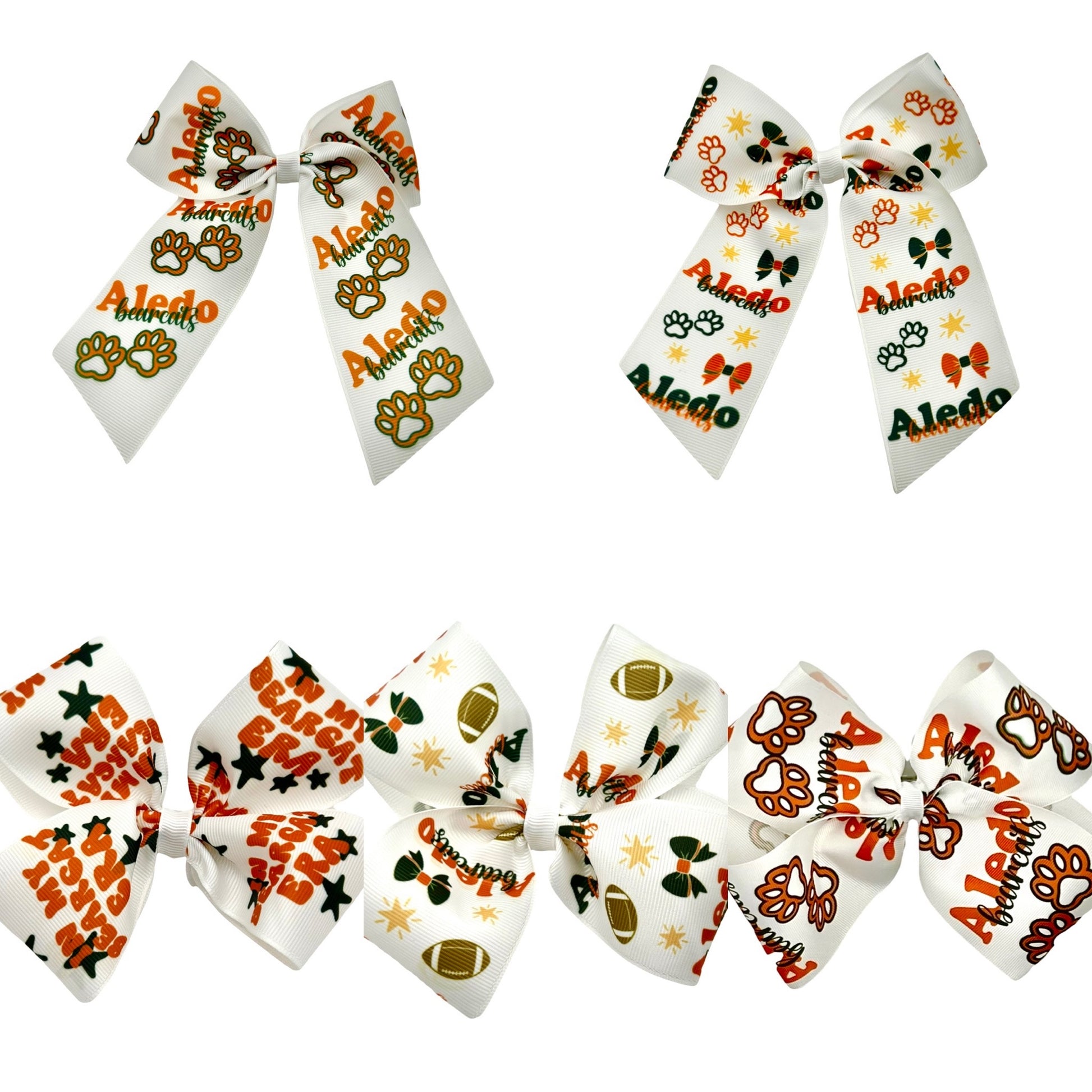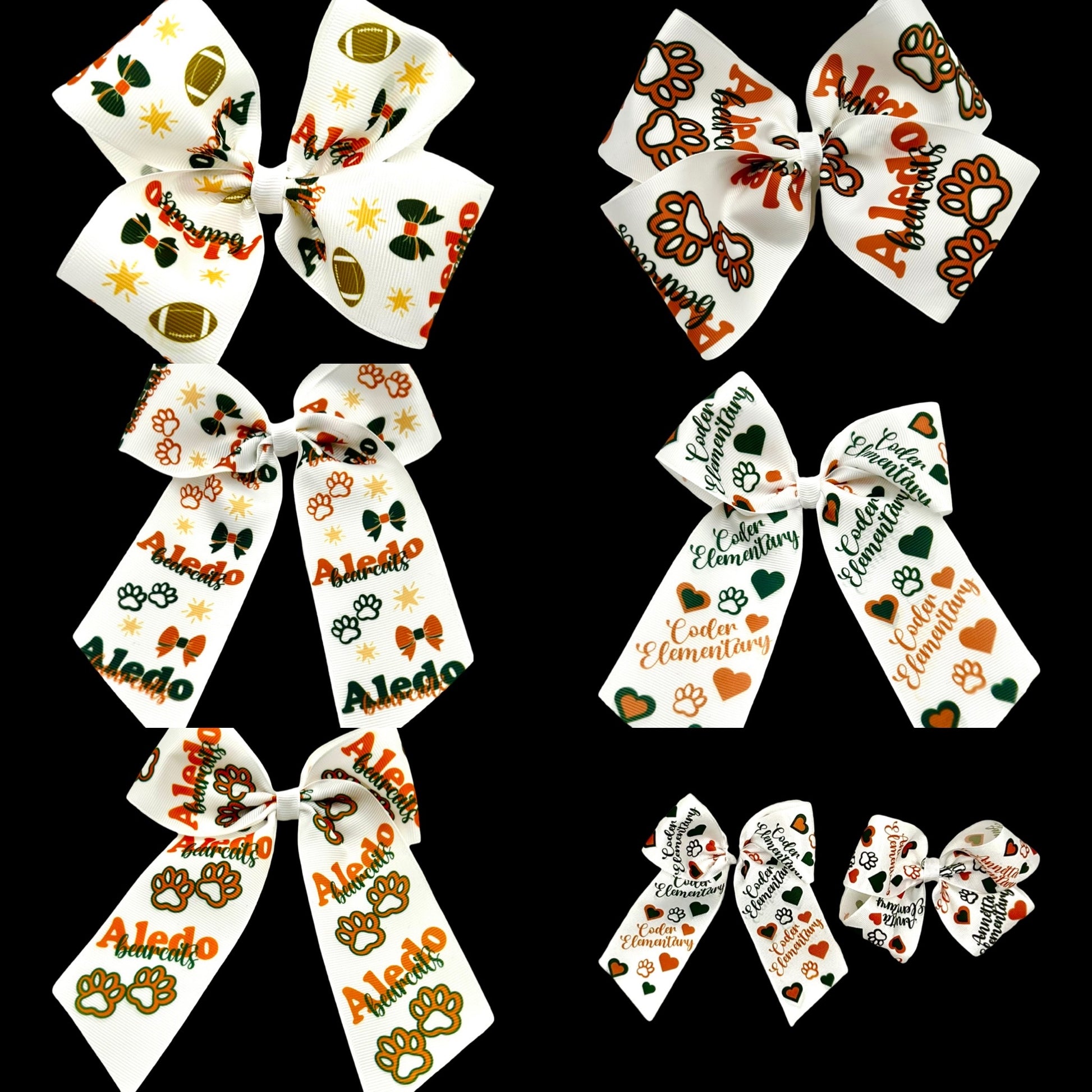 Show your school spirit with one of our unique, custom designed back to school bows designed and available only from The Hat Lady website. Made with 2 inch grosgrain ribbon and available in either boutique style or tail style. Boutique style bows measure approximately 6 inches across. Tail style bows measure approximately 5 inches across and 7 inches long.  Available in multiple designs.